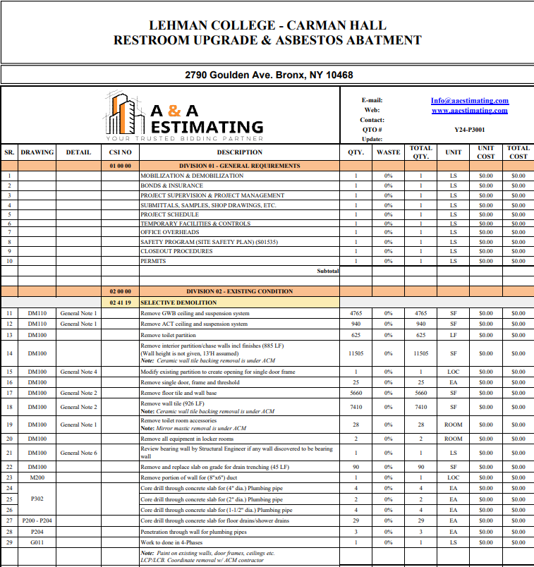 - Bid-ready estimate developed using current market pricing and industry standards